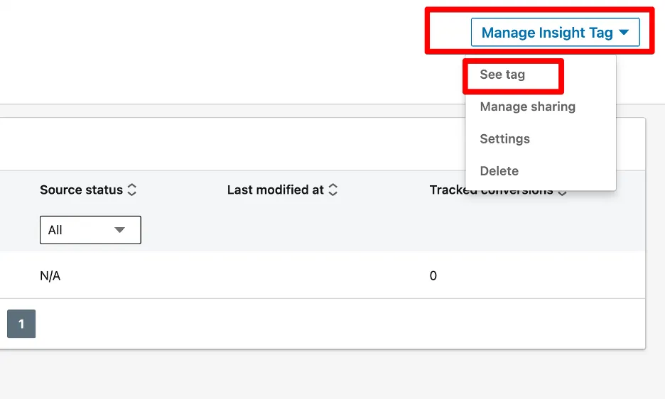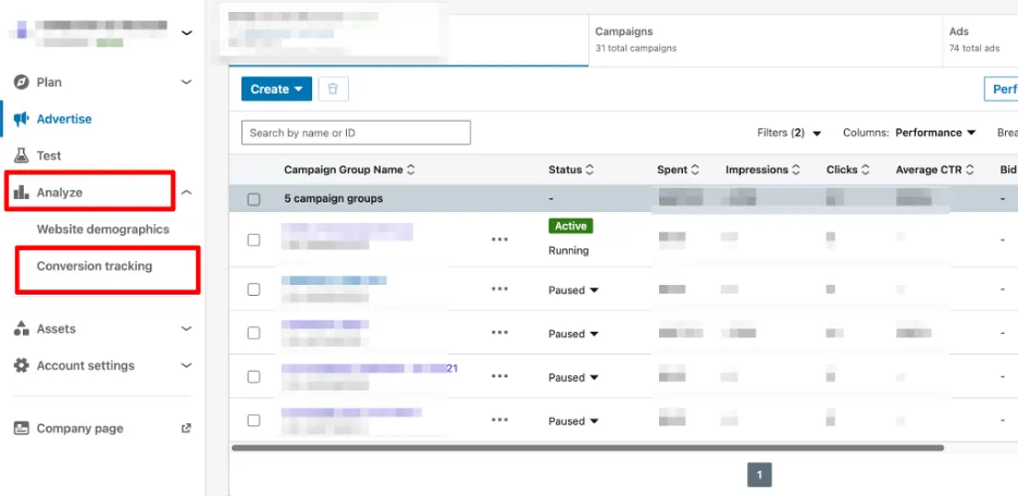Before setting up, make sure to install the Insight Tag on each page of the site where you want to track conversions.To install the LinkedIn Insight Tag code, click the Analyze drop-down menu and select Conversion Tracking.