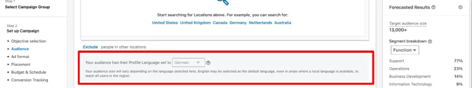 If you plan to show ads to several countries, it’s recommended to split ads into several groups and campaigns. This campaign should include a list of countries with similar advertising expenses. For example, you can combine the following countries into one campaign: the Philippines, Bangladesh, Egypt, Thailand, South Africa, Poland, Turkey, Brazil, and Kenya.Do not forget to exclude countries you don't want to target.2. Select the language of the LinkedIn profile. If you are going to show ads in European countries, set your default language as English to increase your audience reach.