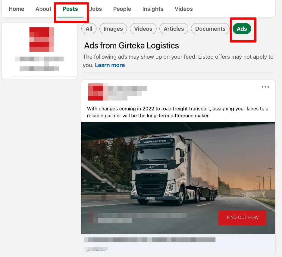 We highly recommend that you conduct a competitive analysis to understand what approach your competitors use in LinkedIn Ads. This way you’ll be able to customize your message and feel your competitors’ trends. It should be noted that you will never know what your competitors are targeting for sure. However, they may use the same lists of companies that you do in Account Based Marketing. Here’s how you can see what advertisements your competitors do in LinkedIn ads:1. Go to the competitor's LinkedIn profile.2. Navigate to Posts.3. Next, click Ads.