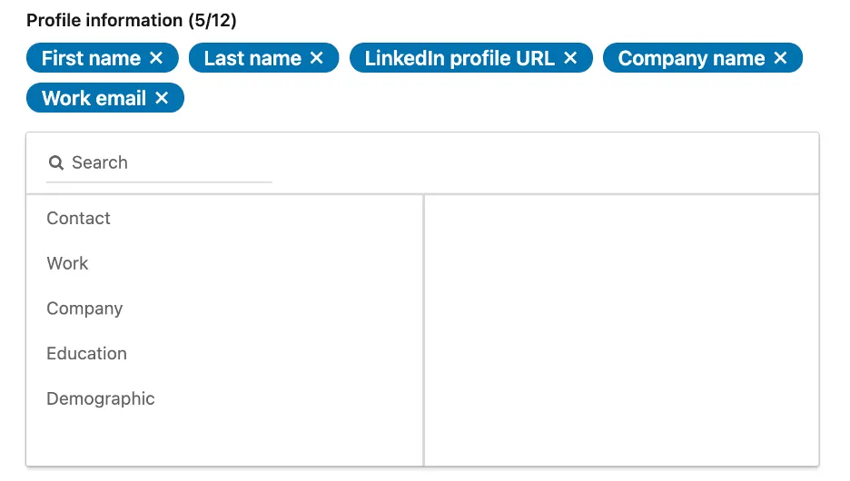 - After that, fill in all the necessary fields in the form. There is one golden rule when it comes to preparing lead forms: the less we ask from people, the greater the chance of converting them into leads. Therefore, keep the most necessary fields and get rid of the rest. We recommend including the following fields: First Name, Last Name, LinkedIn profile URL, Company name, and Work email. These fields are pre-populated.