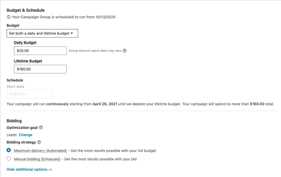 - Choose the ad format. The most popular formats are Single image ads, Carousel image ads, and Video ads.5. Navigate to the Placements field and select LinkedIn. LinkedIn Audience Network is used in exceptional cases when the audience size is too small.6. Define the budget and ratesDepending on your advertising budget, we recommend you set a lifetime budget and let the LinkedIn algorithm calculate the necessary daily budget for you. Also, we recommend choosing an automated Maximum delivery bidding strategy.Select Manual bidding only if you’ve already launched successful LinkedIn Ads campaigns, have a good understanding of the product being advertised, and want to control costs and bids yourself. In other cases, it is better to rely on the LinkedIn algorithm and choose automated Maximum Delivery.