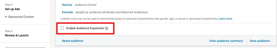 - Now go to your target audience settings. LinkedIn offers the following options:● Job title● Job seniority● Job function (department)● Skills (on the profile)● Groups● Company size● Company industry● Company name (works both for inclusion and exclusion)● Education● Demographics (location)● Years of experience (not recommended)● GenderIf you don’t use Job Titles in targeting, make sure to exclude Sales, Marketing and Business Development related job titles.Leave the following checkbox empty: