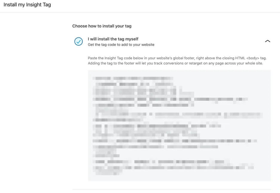 Next, you can copy the generated code and forward it to web developers, or add it manually. If you want to do it yourself: paste the Insight Tag code below in your website's global footer, right above the closing HTML <body> tag.