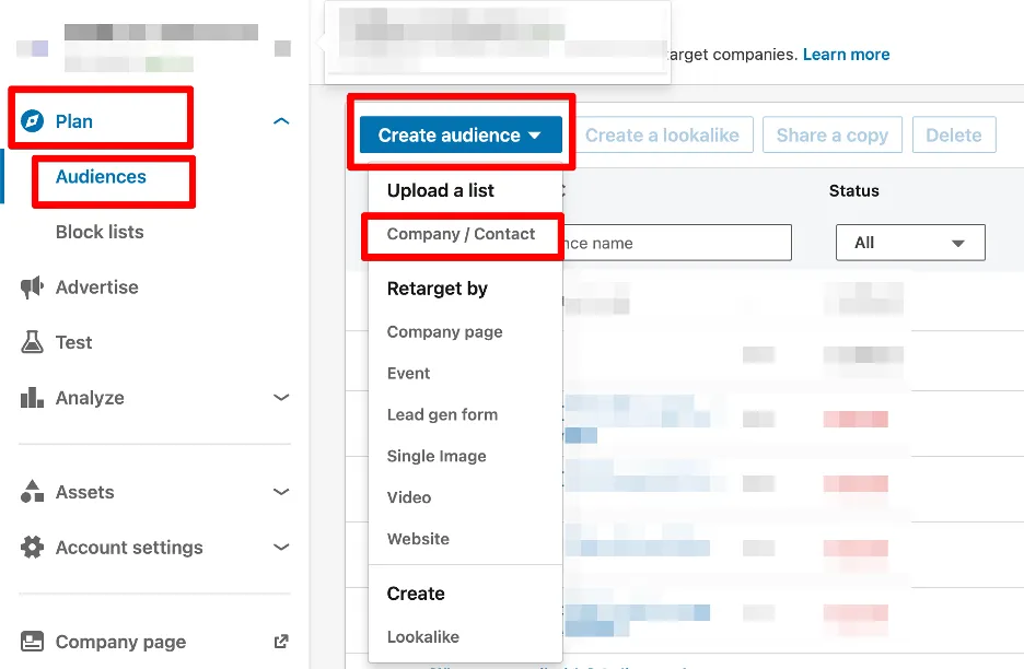 If you have more than 500 companies, prepare a list in a CSV file and upload it to LinkedIn. Here’s a detailed guide on how to upload a CSV file to LinkedIn:1. Navigate to Plan and select Audience. Click Create audience -> Upload a list -> Company/Contact