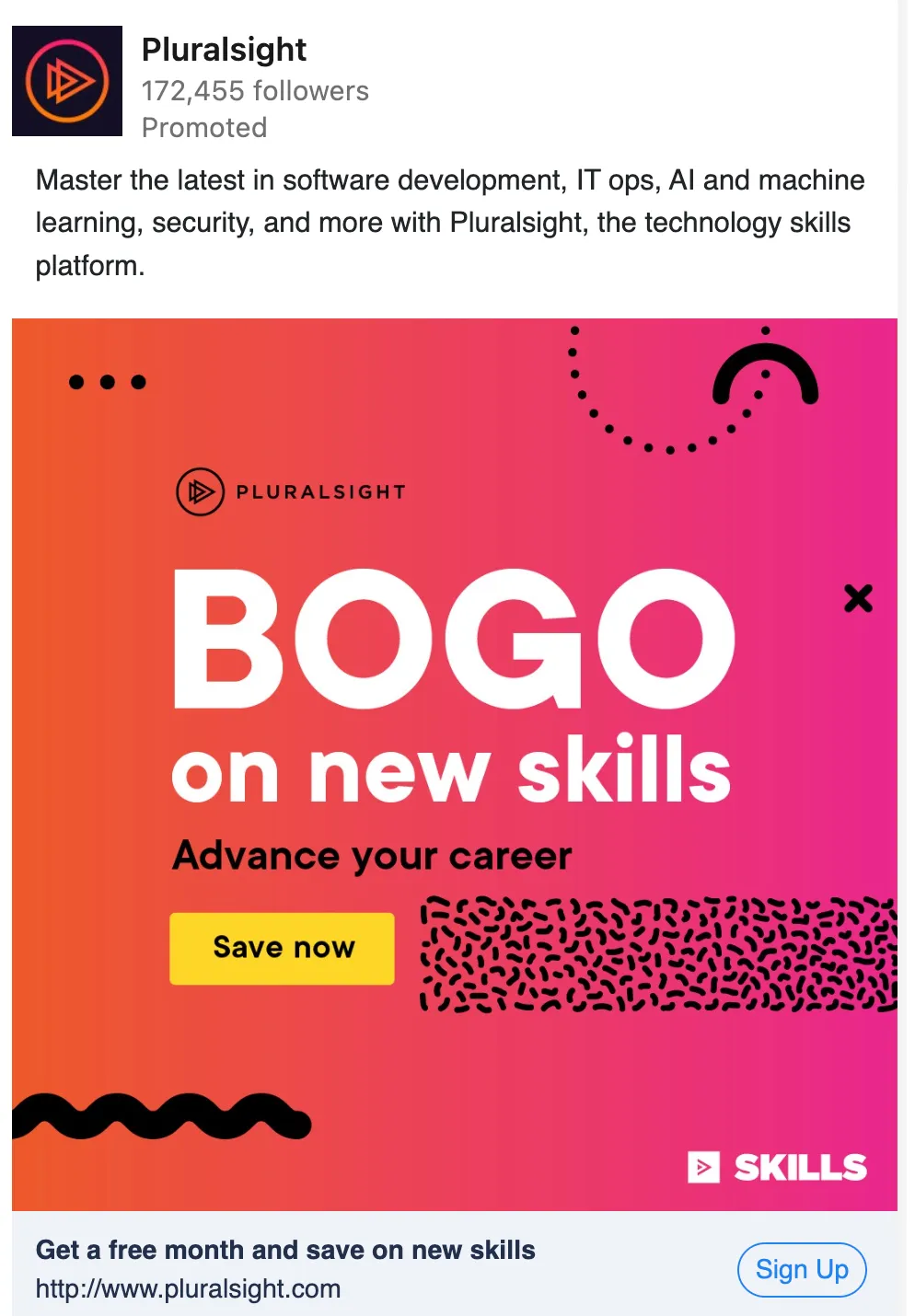 - Pluralsight Promoting the opportunity to master the latest in software development, this ad speaks directly to the needs of its target audience. Such trends as AI, machine learning, and security are a truly persuasive incentive for professionals in the tech industry. The text is concise and to the point. It encourages readers to “advance their career” - a message that resonates with professionals looking to get ahead in their field. The ad also offers a free month, which provides further motivation to purchase a subscription and act quickly.