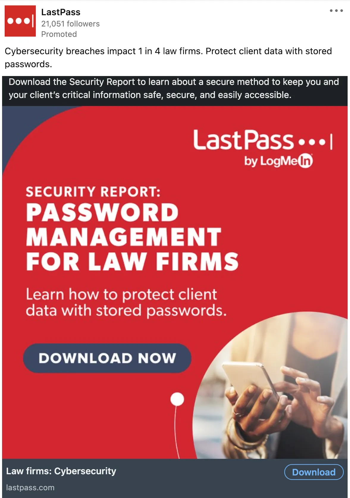 - LastPass This ad message is specifically targeting a particular type of business - law firms. Mentioning "password management for law firms" in the headline, the ad immediately captures the attention of the reader who may be looking for solutions to protect their clients' data. A bright image, large fonts, a minimum of text and a maximum of useful information about a secure method to keep critical information safe, secure, and easily accessible - these are LinkedIn paid ads best practices.