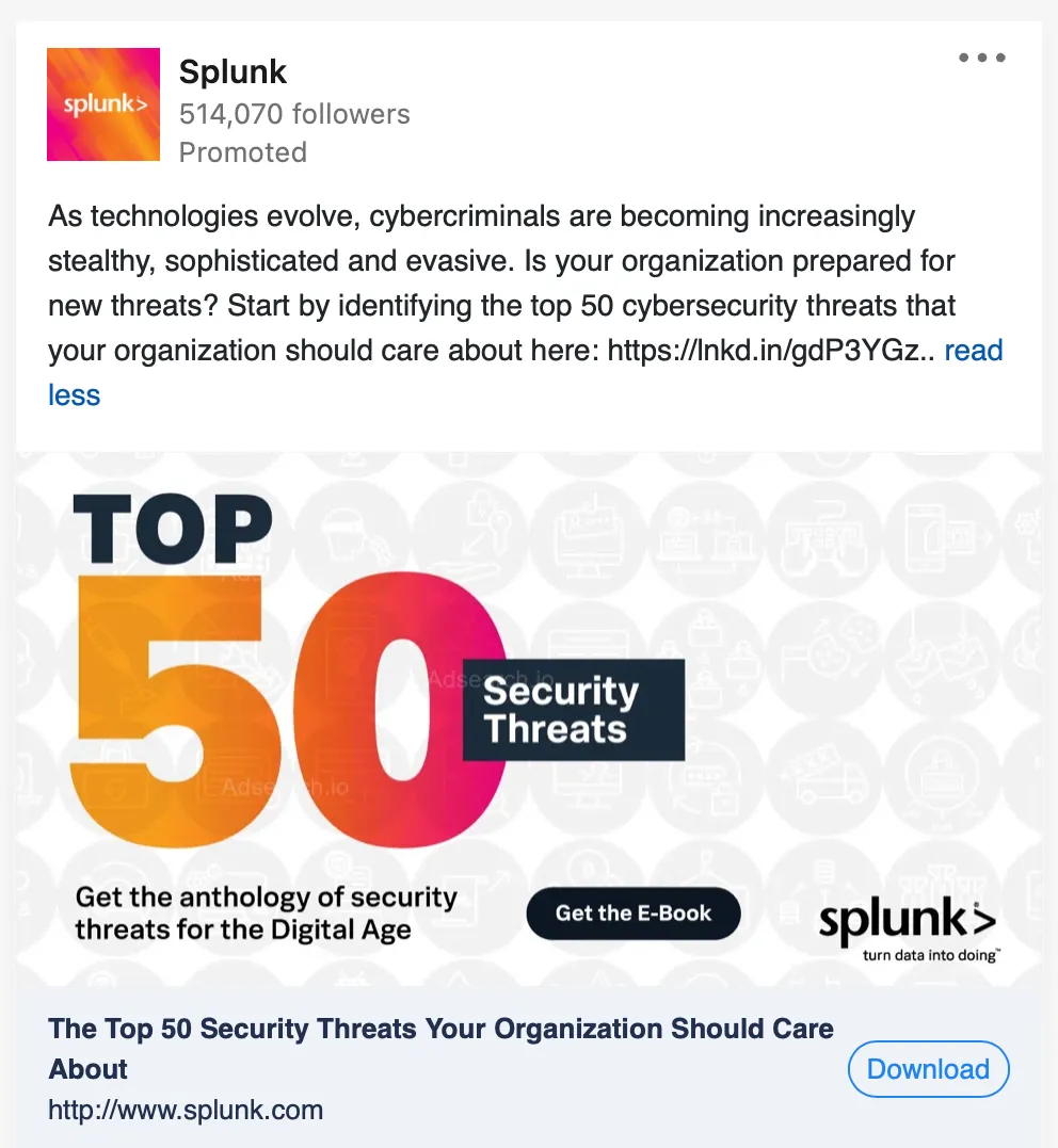 - Splunk This LinkedIn ad is effective because its message is clear and concise. It immediately draws attention to the very real and pressing threat posed by cybercriminals. Asking "Is your organization prepared for new threats?" in a straightforward and honest manner, it taps into a common fear or anxiety and induces readers to take action. The ad also provides a very specific and detailed call-to-action by directing readers to a page where they can start identifying the top 50 cybersecurity threats that their organization should care about. This makes it easy for readers to act on the ad's message and serves as an effective way to capture leads and generate conversions.