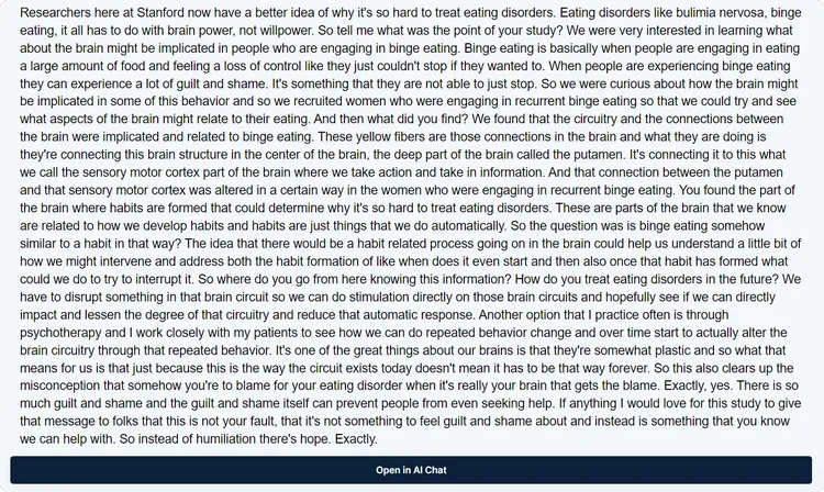 - Now, let's open the transcription in AI Chat. Once the transcript is open, you can start asking AI Chat specific questions. For instance, ask "Can you help me summarize the main points of this text on binge eating?"