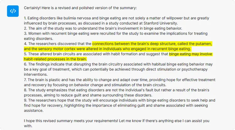 - If you're unclear about any scientific terms or concepts in the summary, you can ask AI Chat to clarify. For example, you might ask, "Can you explain more about putamen and the sensory motor cortex, altered in individuals who engaged in recurrent binge eating?"