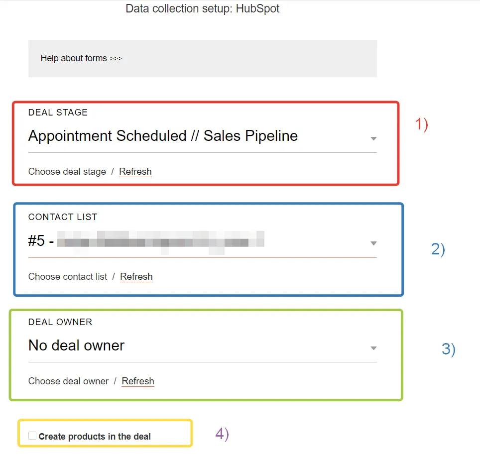 На стороне Tilda вы можете настроить попадание в определенную стадию сделки (1), выбрать один из уже существующих списков контактов в HubSpot (2), назначить ответственное лицо за сделки из формы (3), а также поставить галочку для создания продуктов Products для каждой сделки (4).